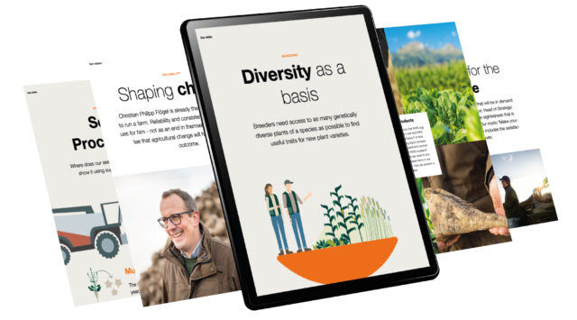 A digitally animated info graphic, for example, describes in an easy-to-understand way all the breeding steps leading to one variety out of hundreds of thousands of candidates being awarded approval. Similarly, we show how our seed is produced – from propagation to packaging of the orange pellets – taking sugarbeet as an example.