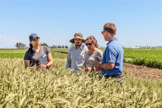 Kenny Piecharka, Belén, and Dener (from right to left) examine a rye field in Alberta, Canada, for upcoming registration trials.