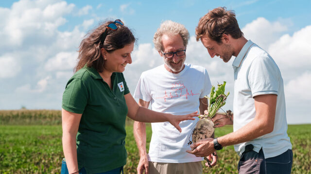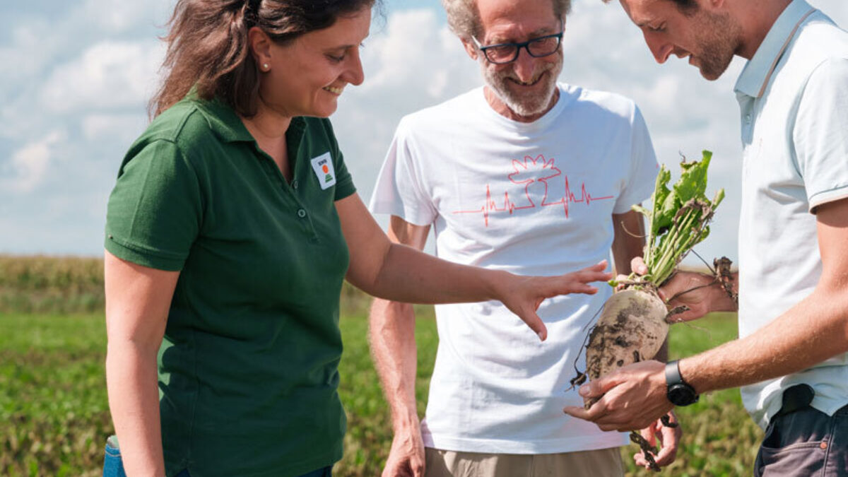 Carlo Pasti (center) and his son Filippo enjoy testing new varieties. On their farm, Chiara De Lucchi can show how sugarbeet develop in farm conditions.