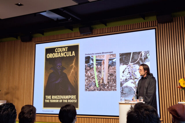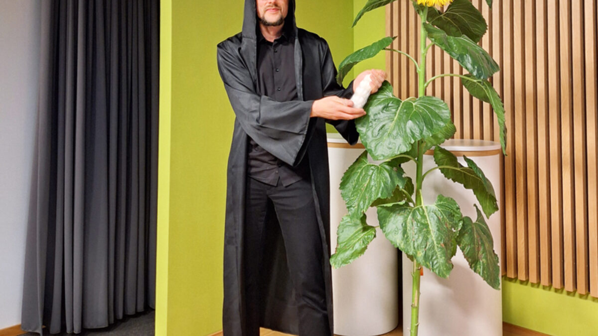And then things got eerie on stage: Dennis Reckwell – with a cape to match – recounted the misdeeds of Count Orobancula, namely the parasitic flowering plant broomrape (Orobanche cumana), the greatest threat to sunflowers in Europe, North Africa and China. Like a vampire, it sucks the sunflower dry until there’s almost nothing left. Even a stake through the heart of the flower is said to be ineffective – and herbicides also have little impact. A new solution was needed, in the form of Van Helianthus. This fearless vampire hunter is created from the genetic resources of wild sunflower variants. Through crossing and analyses, Dennis’ team is currently trying to identify resistance genes for broomrape. Then Van Helianthus can step into action and protect the sunflowers from Count Orobancula.